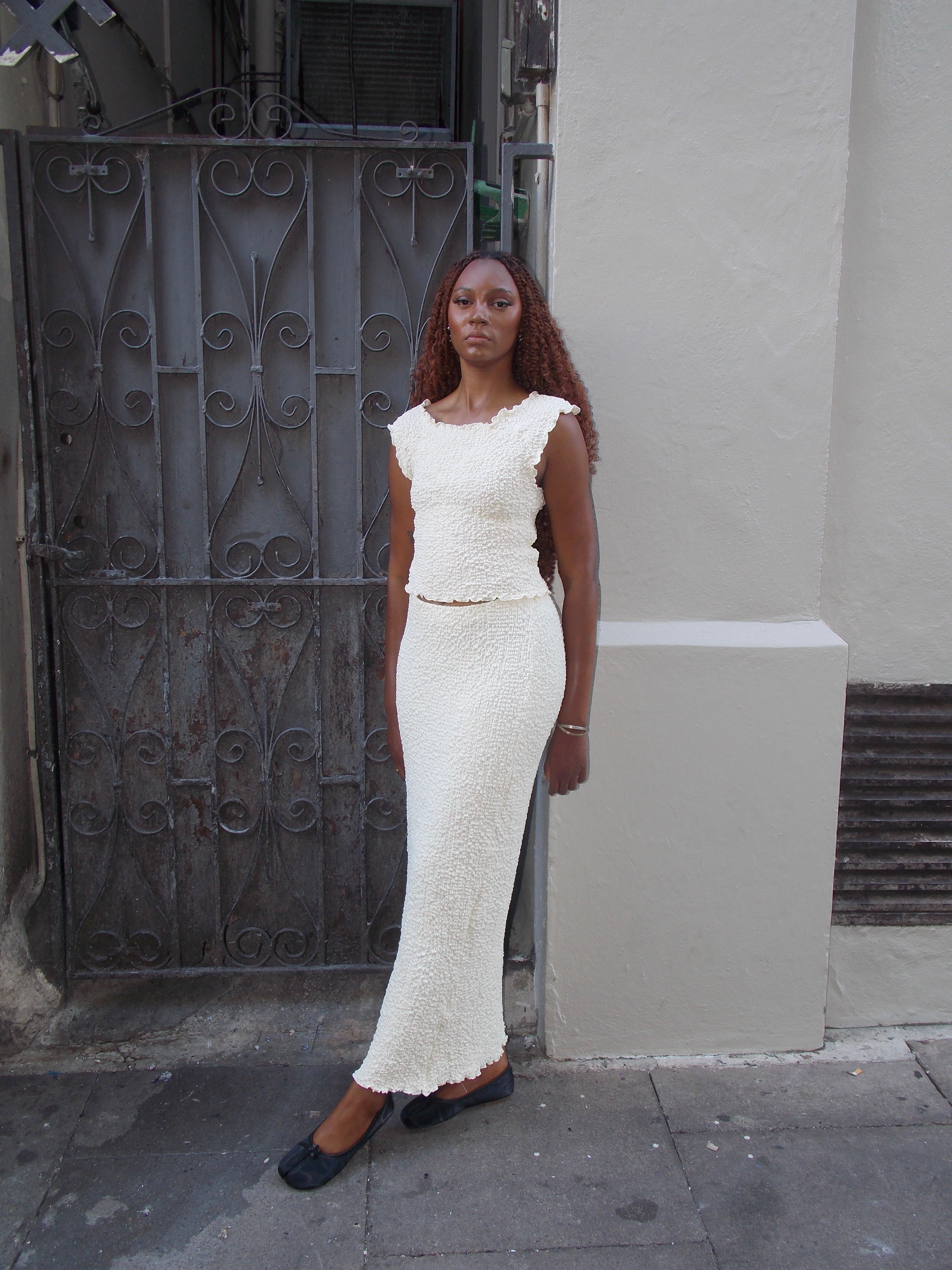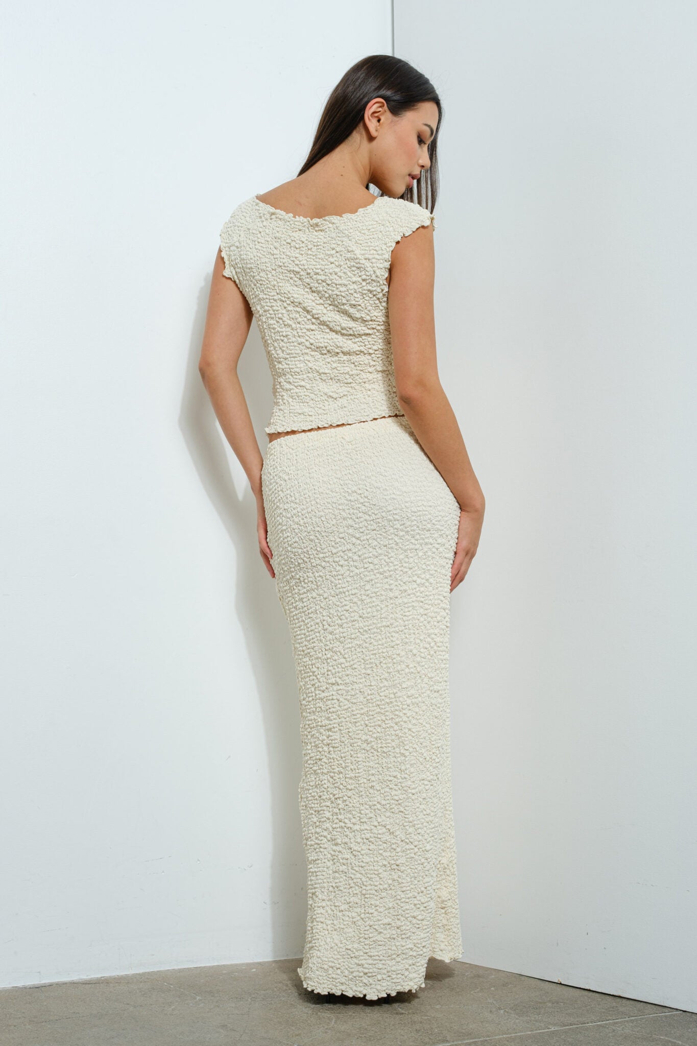 The Gina Skirt is a maxi-length piece made from lightweight, textured fabric for an easy, breezy fit, making it versatile for both casual and dressed-up looks.